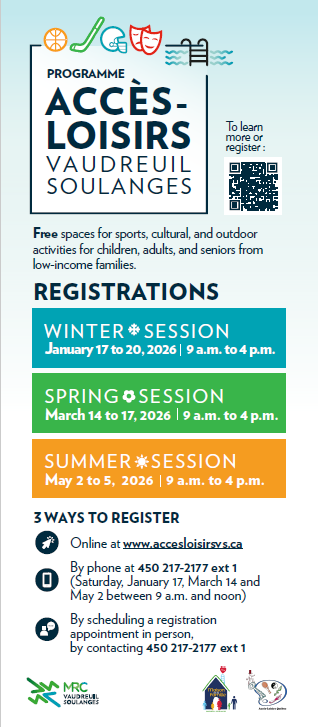 Accès-Loisirs Vaudreuil-Soulanges a pour mission d’offrir à des familles à faible revenu des places gratuites pour des activités sportives, culturelles et de plein-air.