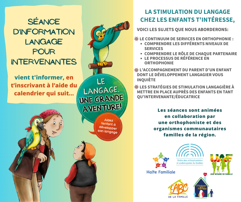 Nous offrons également des séances d’information en collaboration avec le CISSSMO et son équipe d’orthophonistes. Ces séances sont spécialement conçues pour les parents et les intervenants, afin de les outiller à mieux comprendre les enjeux et problématiques entourant les retards de langage. Vous y apprendrez comment identifier les signes, référer aux services appropriés et aller chercher l’aide nécessaire pour soutenir les enfants dans leur développement langagier.